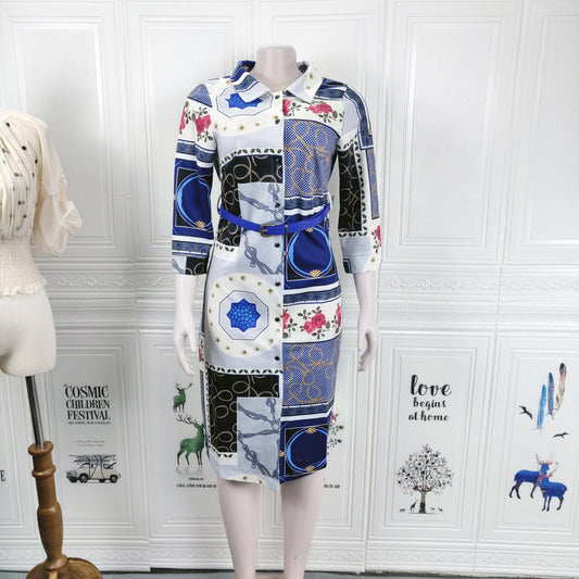 African Style Digital Printing Women's One-way Neck Sexy Mid-sleeve Dress With Lace Fashion Casual Pocket Skirt