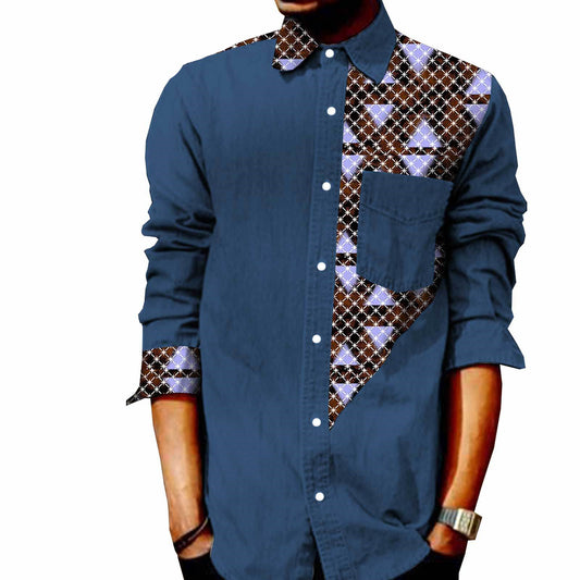 T Shirt Homme En Coton Imprime Batik Africain Manches Longues Denim Style Streetwear Décontracté